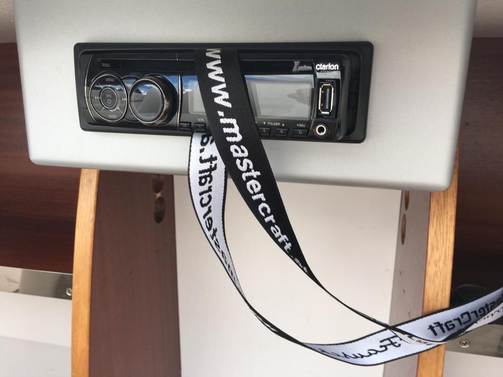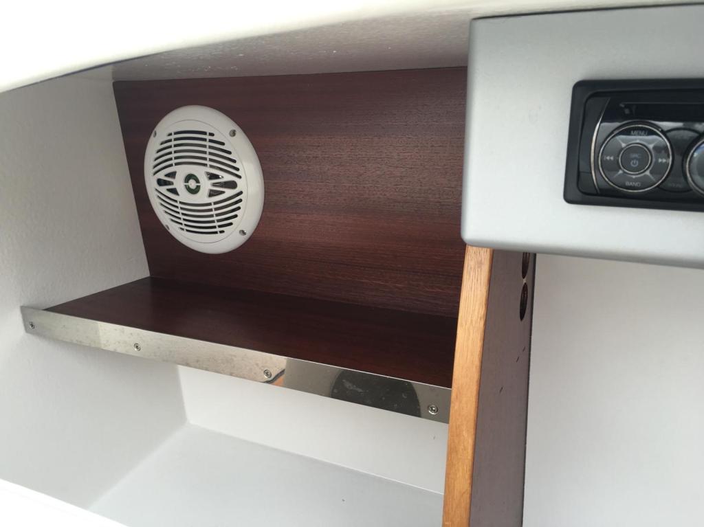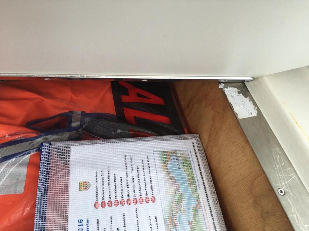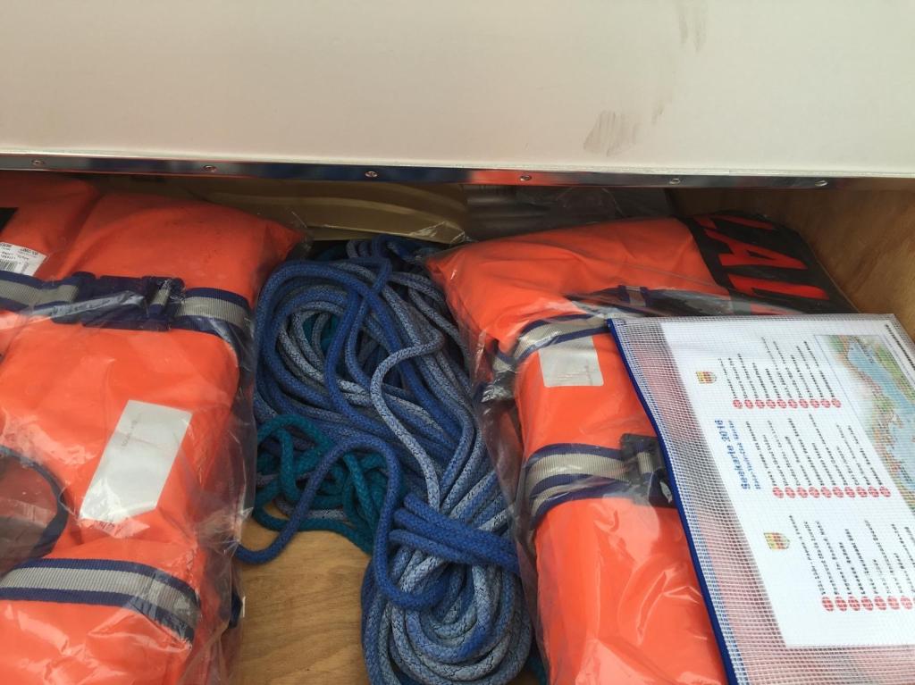 • Radio, diverse Schwimmweste, Startschlüssel, Verbandskasten, Bootshaken, Paddel, Anker, fix montierte Badeleiter, Persenning, div. Belegleinen, Sonnenschirm, Fender